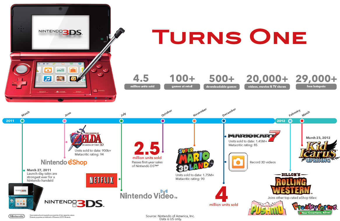 Later this month, on March 27th, the 3DS handheld will celebrate its first birthday. Nintendo has put out a press release showing a timeline of all its successes to date:
